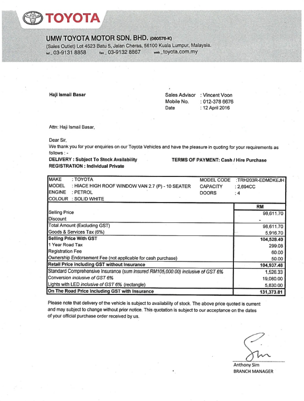 Harga Van : (UMW Toyota, Batu 5 Cheras : RM131,373.81)